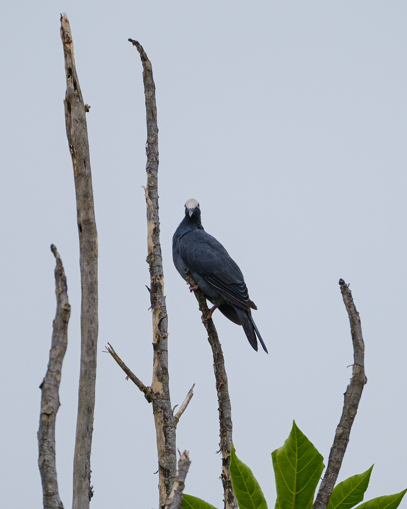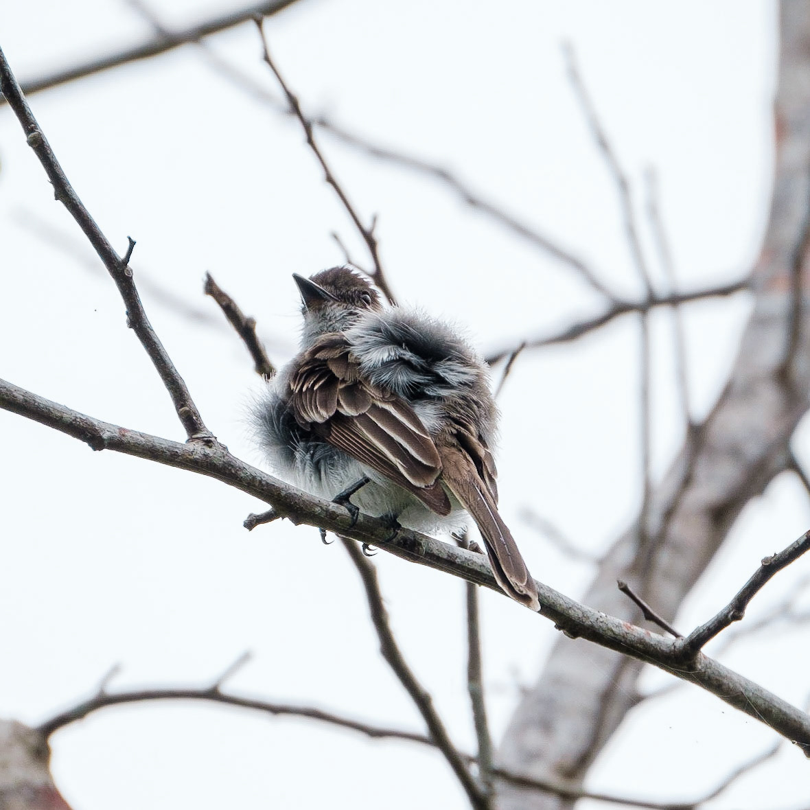 Pájaro carpintero joven mirando al horizonte sobre la punta de una rama seca