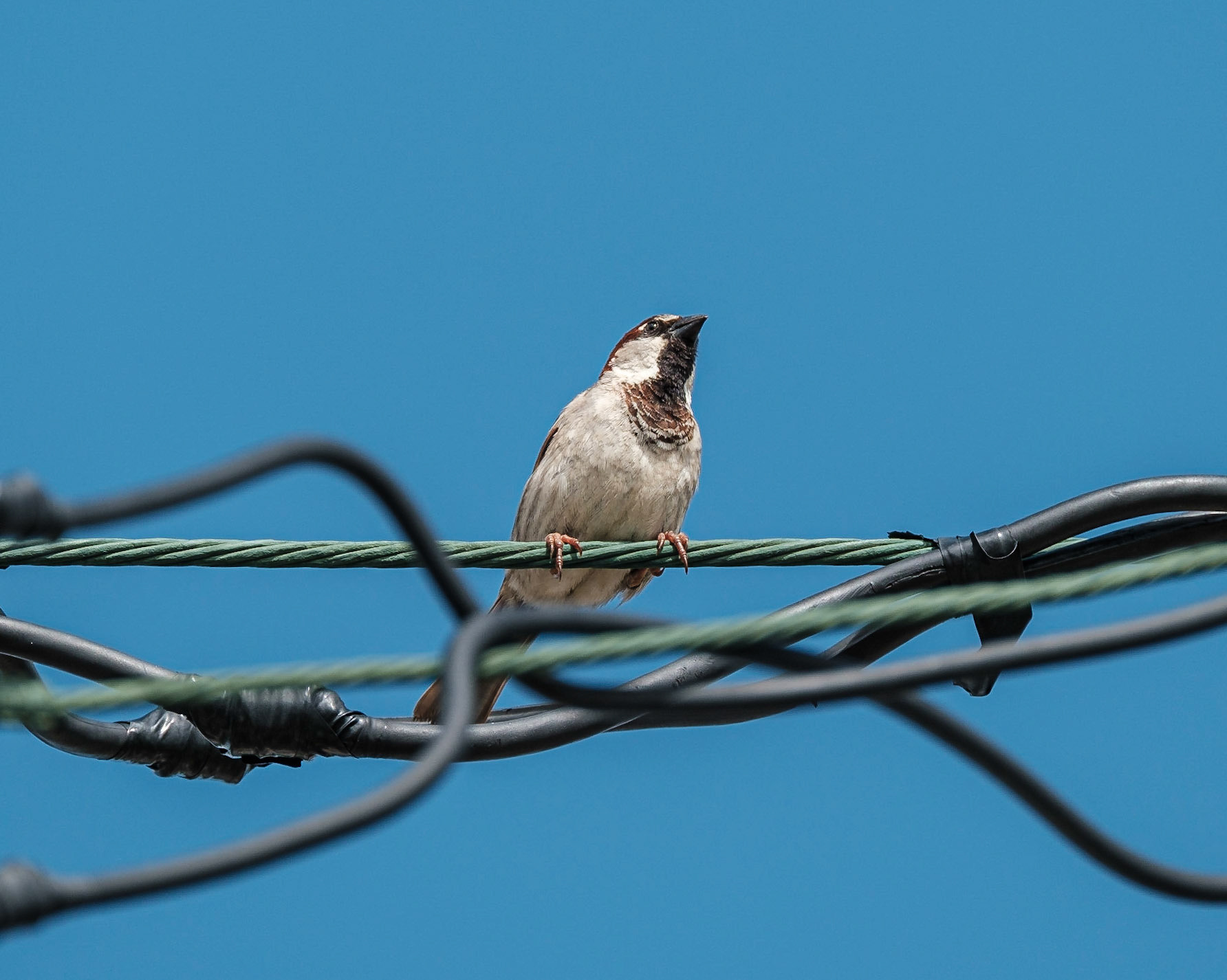 Falcón Común macho parado en un cable eléctrico